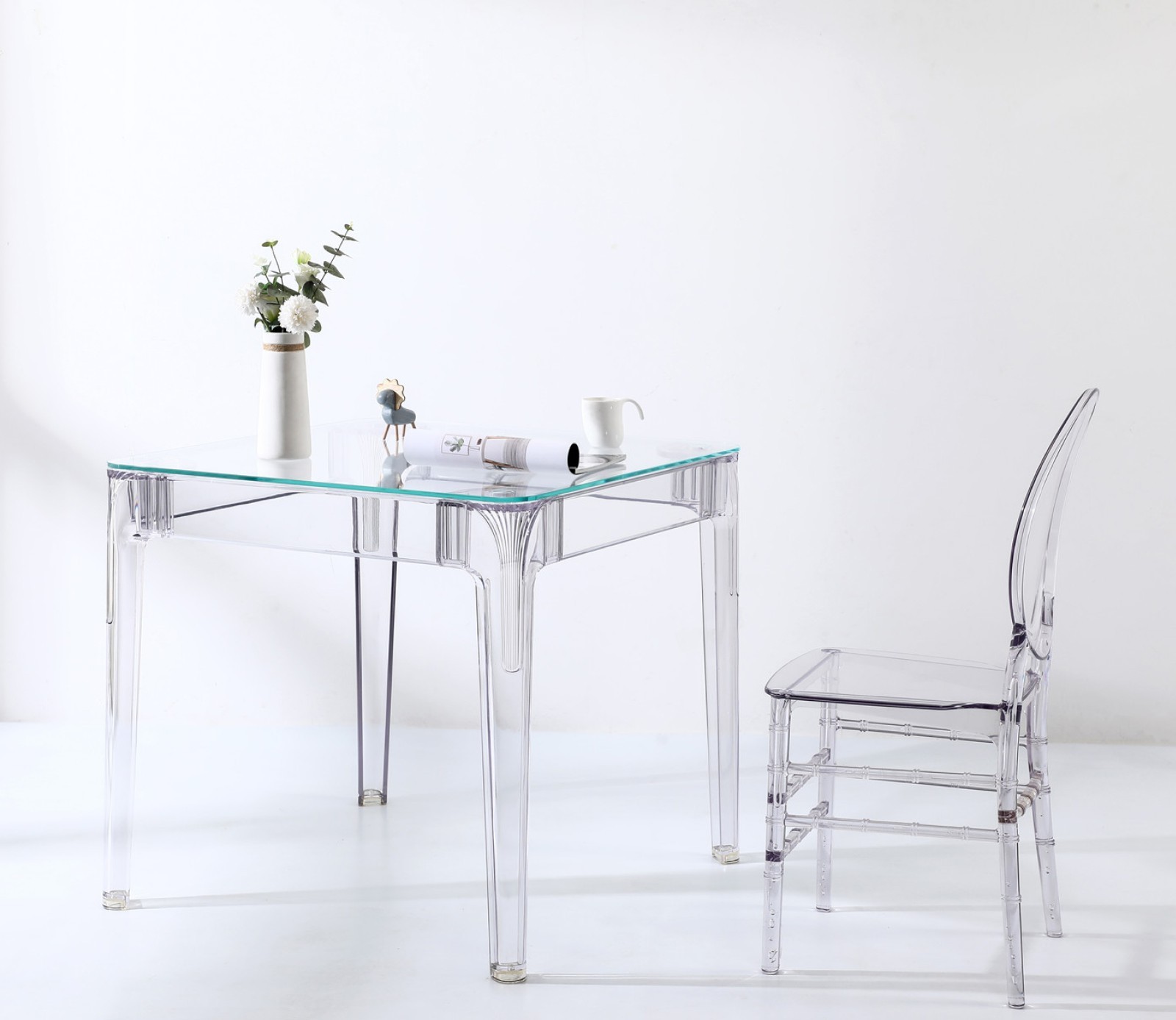 Its structure is composed of transparent polycarbonate legs, a material known for its strength, lightness and durability, which provides a very characteristic floating aesthetic. The high-strength tempered glass table top completes this iconic design, offering an elegant, safe and easy-to-clean surface.