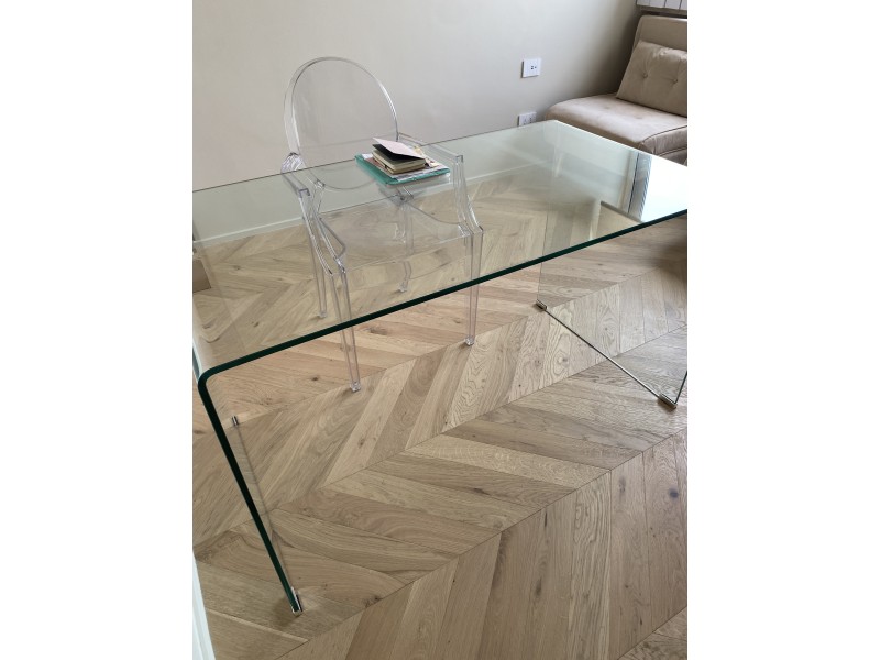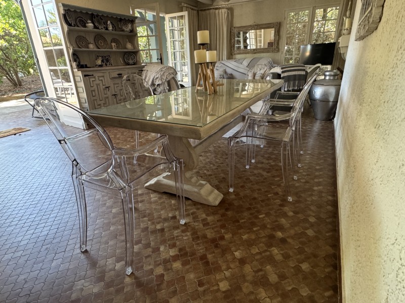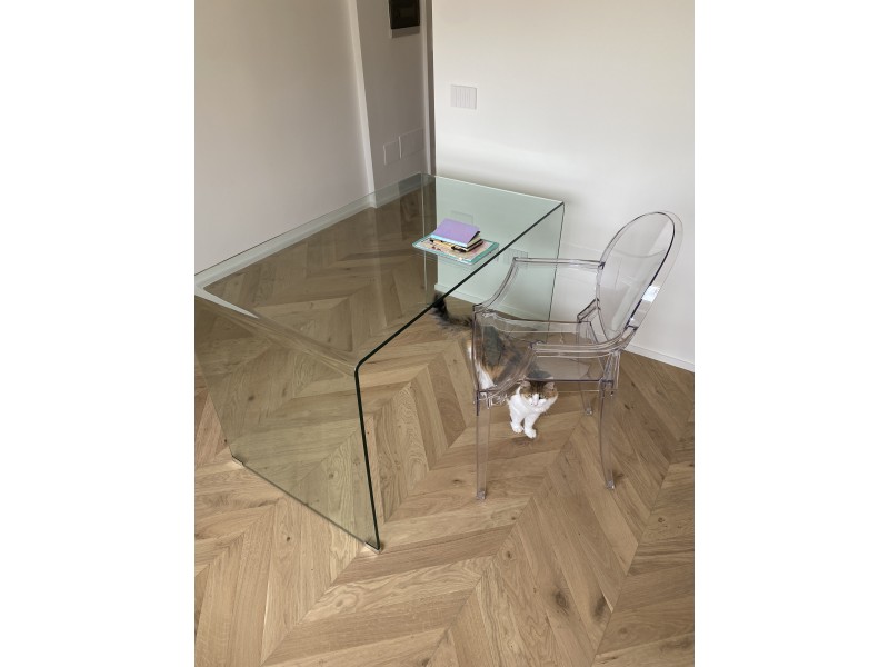 Fabricada em policarbonato transparente, esta cadeira é resistente, leve e visualmente etérea, ideal para quem pretende dar estilo sem sobrecarregar a divisão. Graças aos seus apoios de braços integrados, oferece uma experiência de utilização mais envolvente e confortável, perfeita para longas refeições depois do jantar, celebrações ou reuniões formais.