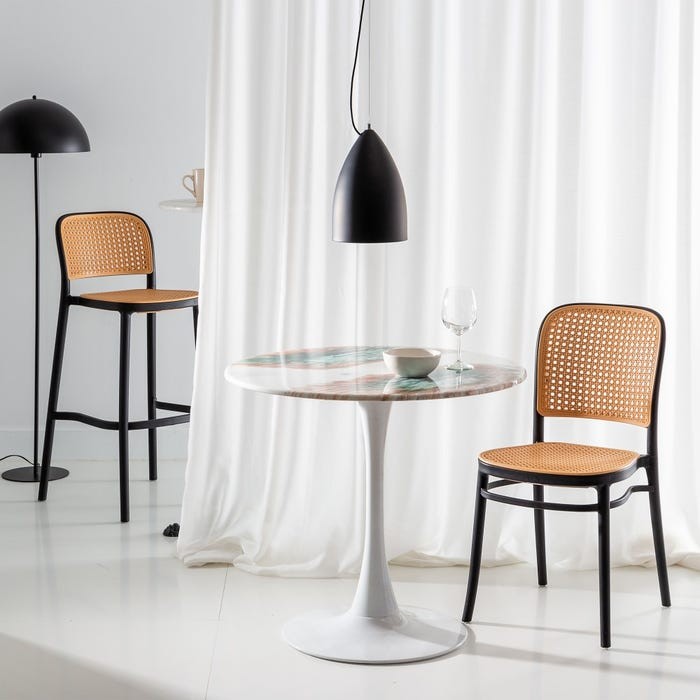 É ideal para ambientes externos e internos, pois sua estrutura é de plástico polipropileno e o assento é de rattan sintético. Ideal para cozinhas, balcões de bar, restaurantes e áreas externas.